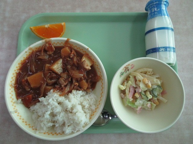 麦ご飯 牛乳 ハヤシライス マカロニサラダ オレンジ