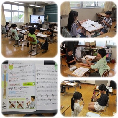 3・4年生の音楽では、「レッツゴー ソーレー」の曲のリコーダー練習をしました。4年生が3年生に指使いなどを教えてくれました。複式学級のよさを生かして、みんなでがんばりました。