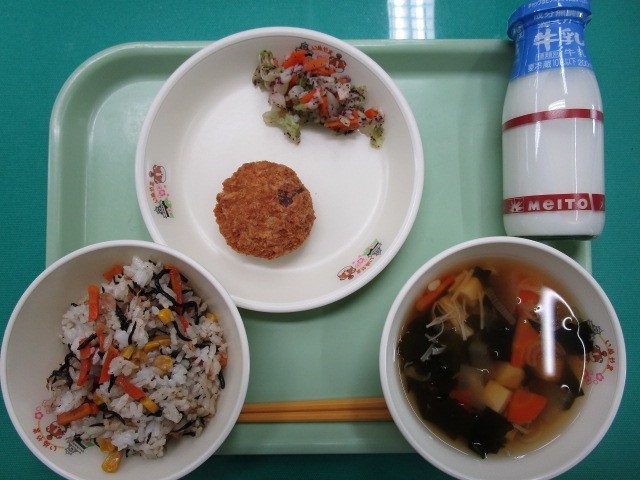 ひじきご飯 牛乳 なす味噌メンチカツ ゆかり和え すまし汁