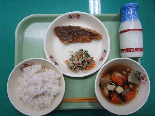 麦ご飯 牛乳 ホキの揚げ煮 ほうれん草の白和え風 つみれ汁