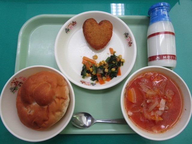 りんごパン 牛乳 かぼちゃのコロッケ ほうれん草とコーンのソテー ミネストローネ