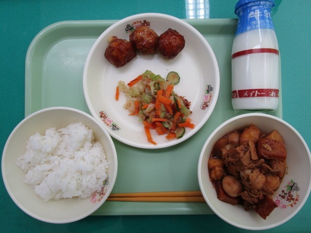 ご飯 牛乳 愛知県産食材入り肉団子 キャベツのおかか和え 味噌煮込みおでん
