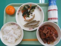 ご飯 牛乳 鶏肉のごまだれがけ ゆかり和え 切り干し大根のみそ汁