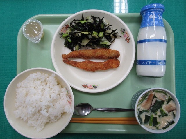 ご飯 牛乳 子持ちししゃもフライ 枝豆のひじき和え 茶碗蒸し 犬山桃ゼリー