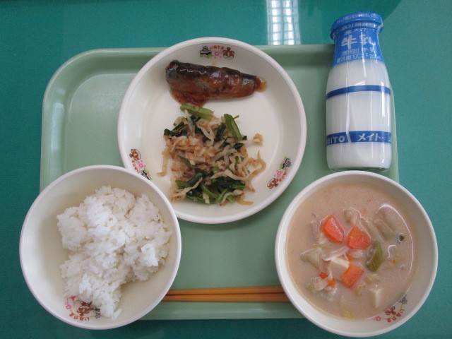 ご飯 牛乳 いわしの梅煮 小松菜と切り干し大根の土佐和え 豆乳鍋