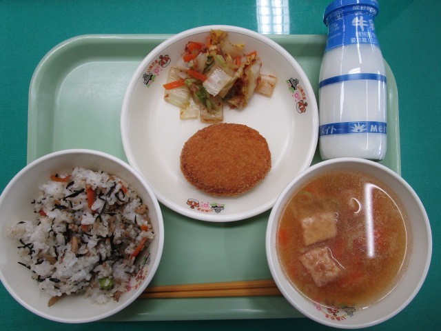 五色ご飯 牛乳 昔ながらのコロッケ 白菜のおかか和え 栄養みそ汁