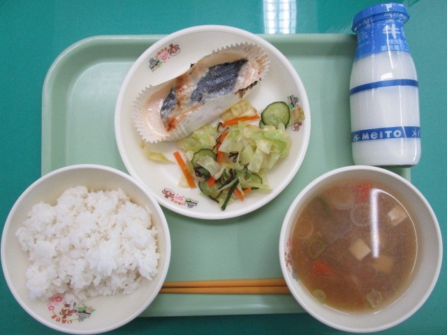 ご飯 牛乳 さわらの味噌マヨ焼き 水菜入り塩昆布和え 根菜のみぞれ汁
