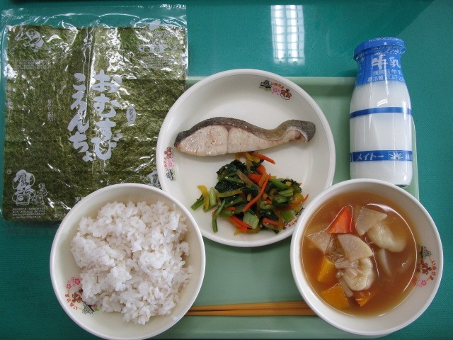 麦ご飯 牛乳 セルフおにぎりのり 鮭の塩焼き 小松菜のたくあん和え すいとん汁