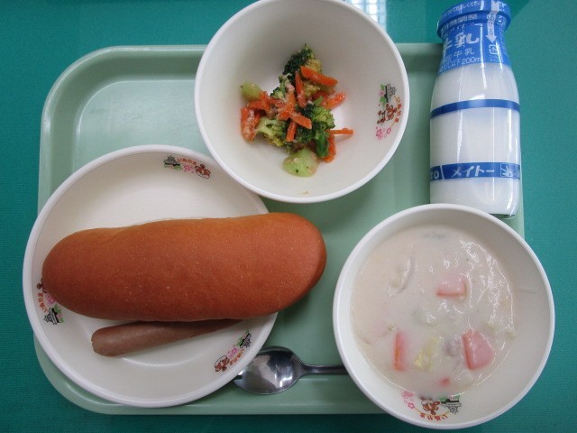 ロールパン 牛乳 かぶと白菜のシチュー 焼きフランクフルト ブロッコリーの和風和え