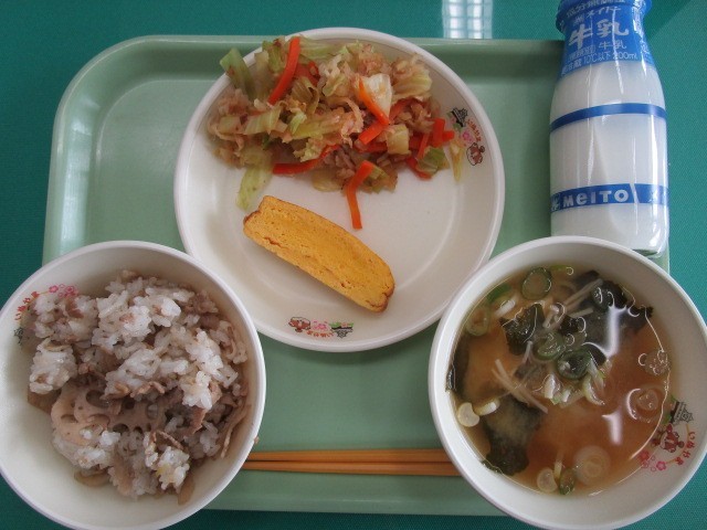 生姜と豚肉の混ぜご飯 牛乳 厚焼き卵 キャベツのおかか和え じゃがいもとえのきのみそ汁