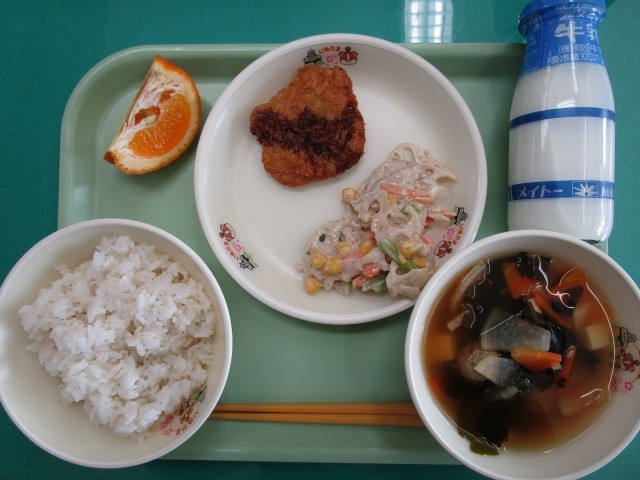 麦ご飯 牛乳 ソースカツ れんこんのごまマヨ和え つみれすまし汁 いよかん