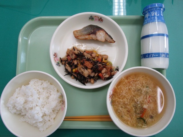 ご飯 牛乳 アジの塩焼き ひじきの五目煮 かき玉汁