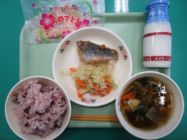 赤飯 牛乳 さわらの竜田揚げ 野菜のなめたけ和え お祝いあおさ汁 お祝いデザート