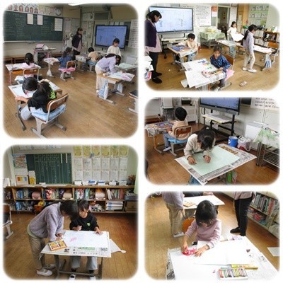 1・2年生、3・4年生は、それぞれの図工の時間に、読書感想画を制作しています。少しずつ構図の構想などが決まり、着色が進んできています。