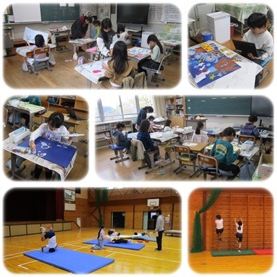 1~4年生は図工で読書感想画に取り組みました。5・6年生は体育でマット運動を行いました。みんながんばっています。
