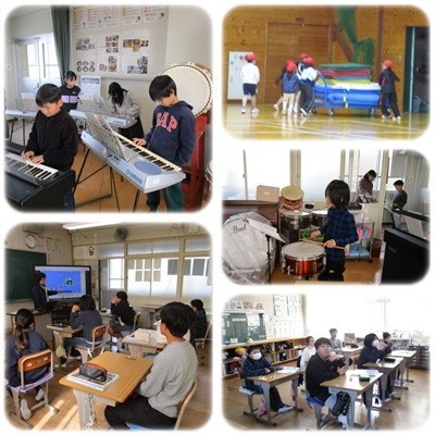 1・2年生は体育、3・4年生は音楽、5・6年生は外国語の様子です。みんなでがんばっていますね。