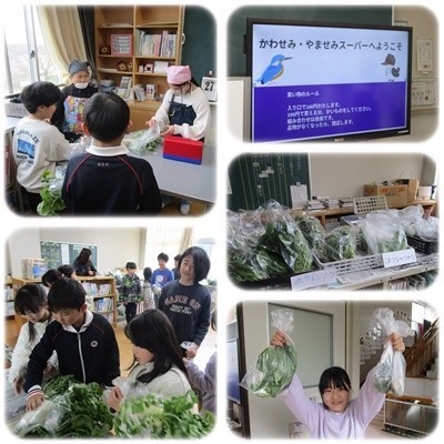 一生懸命育ててくれた野菜を、かわせみ・やませみスーパーとしてみんなに販売してくれました。どの野菜もとてもおいしそうで、児童のみなさんも職員もどれにしようか迷いながら、それぞれ好きな野菜をもらいました。お家で食べるのがとても楽しみです。ありがとうございました。