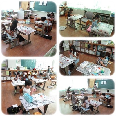 1・2年生の図工では、以前模様を写しとった用紙を切って貼るなどして、作品作りを行っています。みんな工夫しながら取り組んでいます。