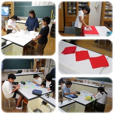 5・6年生の理科では、ふりこのきまりについて実験をして考察しました。おもりの重さなどを変えながら、班で協力して実験に取り組んでいます。