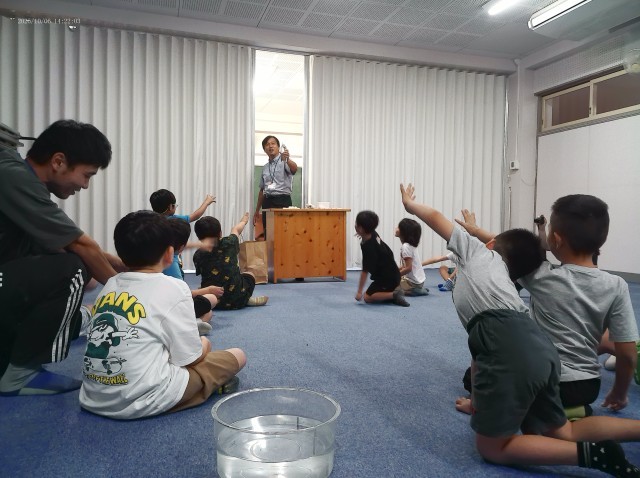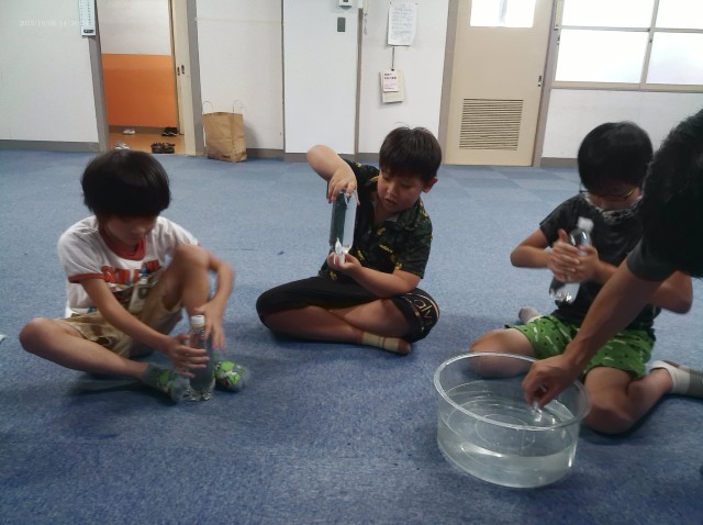 また、ペットボトルの中に、水と、重りをつけた小さな入れ物を入れたものを1人1つずつ作りました。このペットボトルを握ると中の入れ物が沈む不思議な実験道具を作りました。