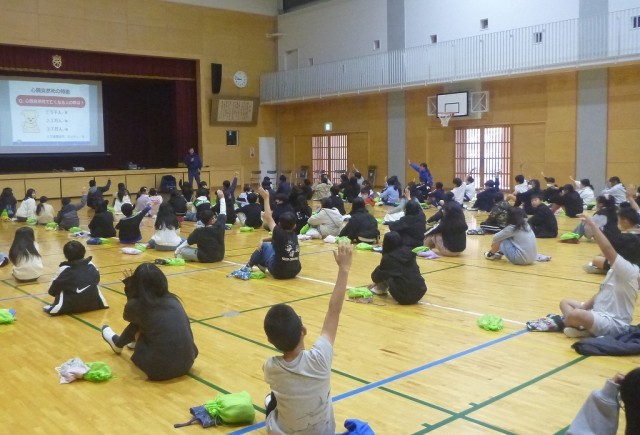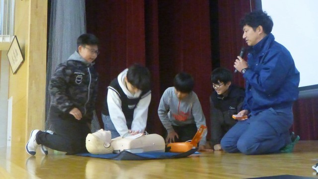 子どもたちは、動画や消防団員の方の話から胸骨圧迫やAEDの重要性を学び、