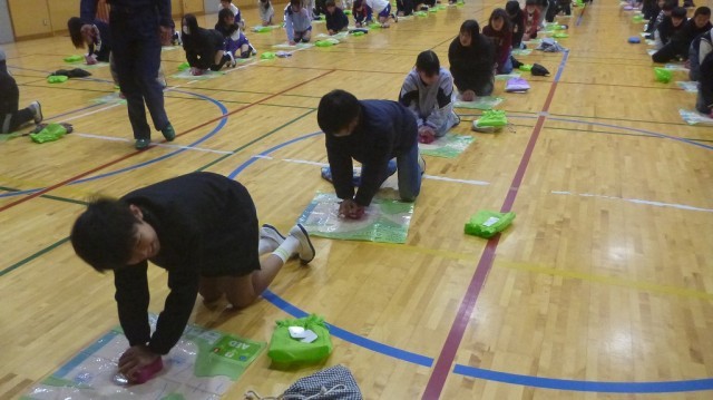 消防署員と女性消防団員の方々が来てくださり、子どもたちに胸骨圧迫の仕方とAEDの使い方を教えていただきました。