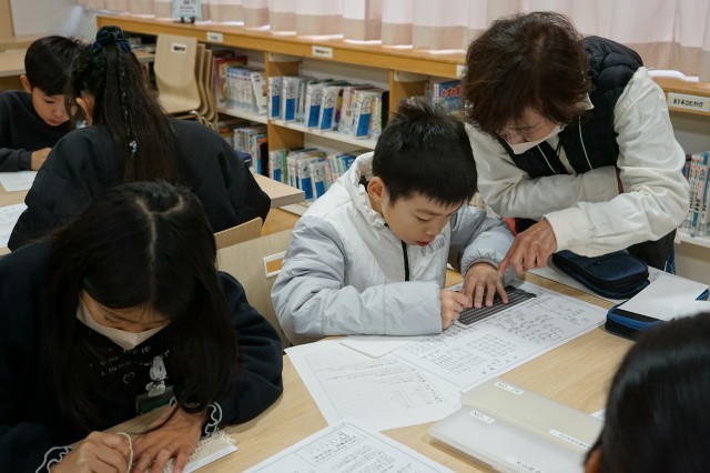 点字表を見ながら、点字器を使って名前や言葉を打ったり、点字を実際に読む活動をしたりして、目の不自由な人への理解を深めました。
