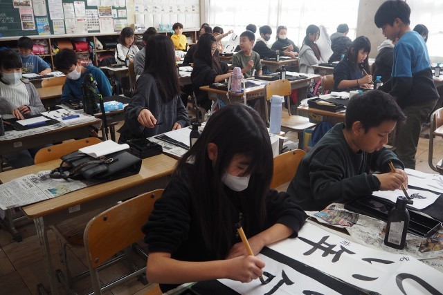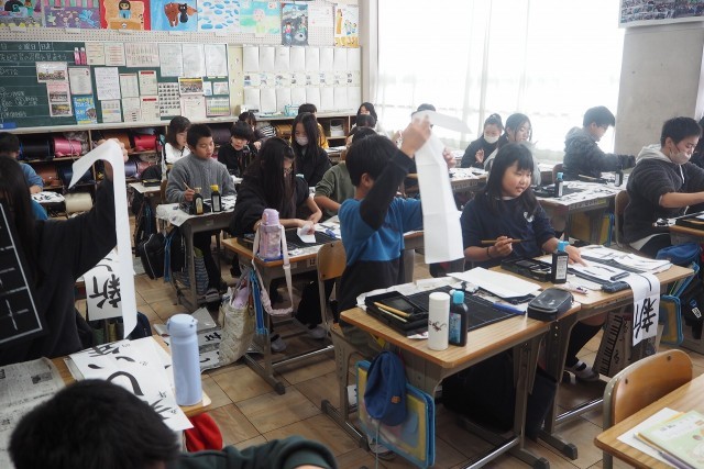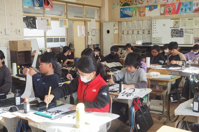 いつもとは少し違う縦長の半紙に苦戦しながらも、文字の大きさや配列に気をつけながら一生懸命書いていました。