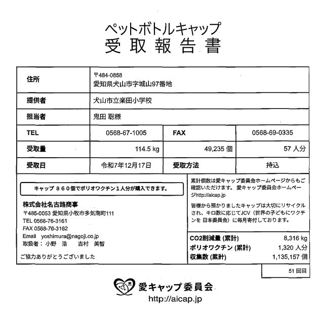 2025年7月から12月までの期間に、合計114.5kg(49,235個)のエコキャップを回収することができました。