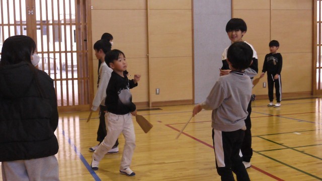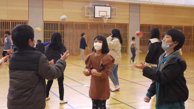 体育館に集まり、ペアの5年生とむかしあそびを楽しみました。