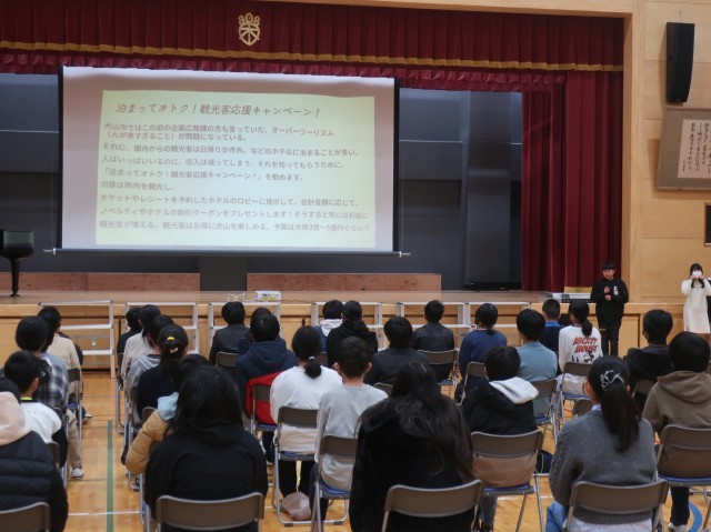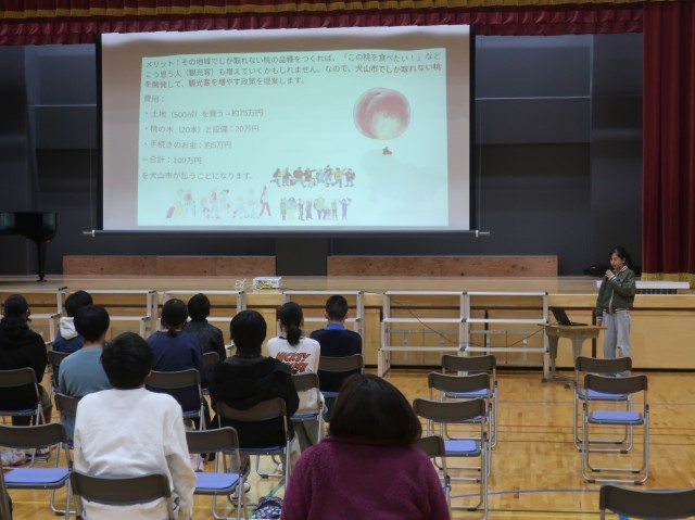 6年生は先日、社会の授業で取り組んでいた、「犬山の未来について考える」学習のまとめとして、体育館で発表会を行いました。