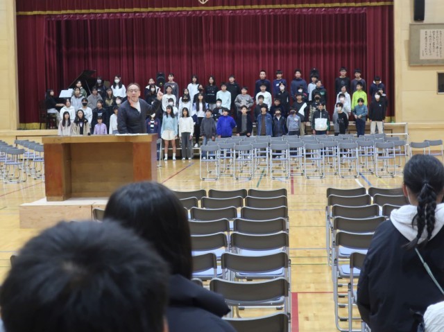 5年生がイスや演台を設置してくださり、いよいよ体育館も卒業式モードです。来週も本番に向けて練習を進めていきましょう!