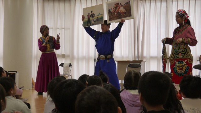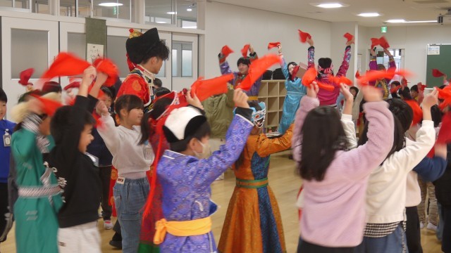 民族衣装を着せてもらった児童もいます。最後は、馬頭琴の音色に合わせて、皆で赤い布をふりながら一緒に踊りました。