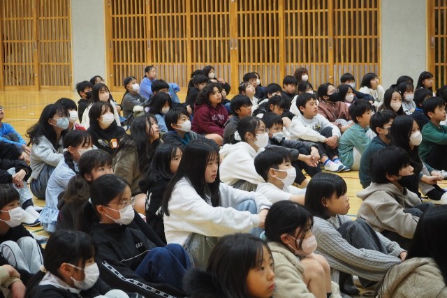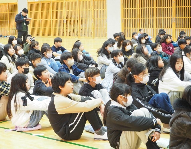 来年度5、6年生になる今の4、5年生が体育館に集まり、教頭先生から学年担任制についての話を聞きました。