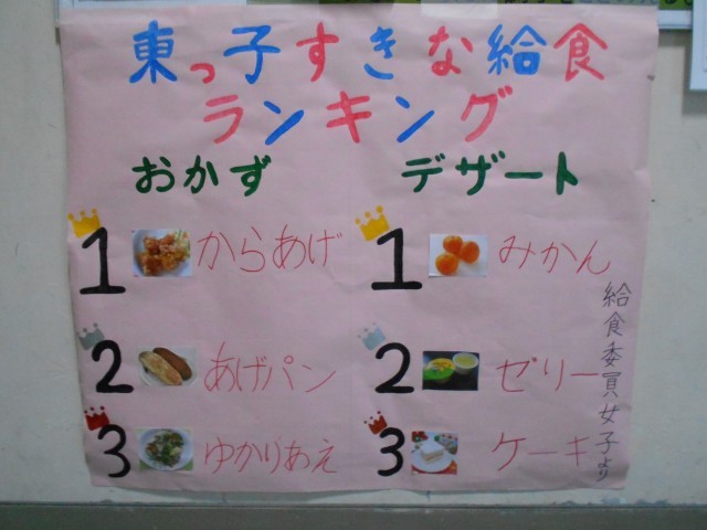 みんな必ずと言っていいほど立ち止まって見ている掲示物です。「唐揚げは絶対だよね」「ぼくも唐揚げって答えたよ」と会話が弾みます。デザートはみかんが1位でした。特に冬になるとおいしいですよね。みんなが投じた1票はランキングに入っていたかな。