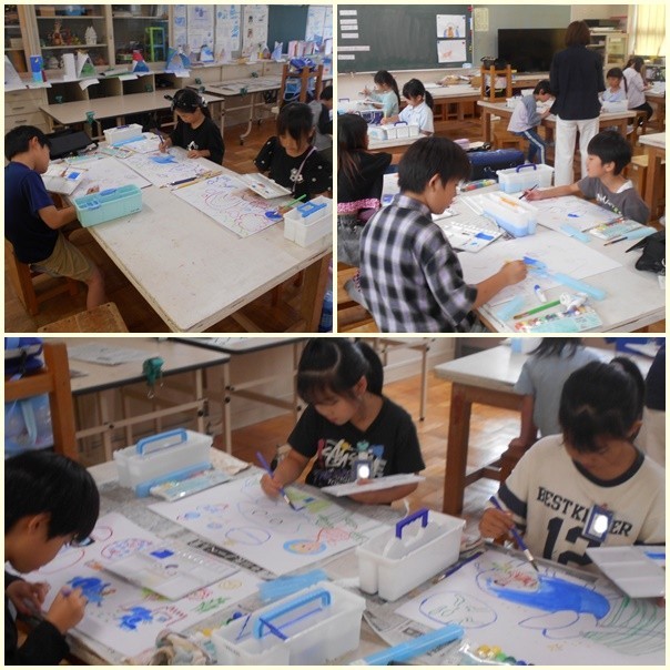 絵の具を使って色塗りをしています。水の量を調整して、濃いところや薄いところを塗り分けていました。筆の使い方も少しずつ学んでいます。みんな静かに集中して取り組んでいました。