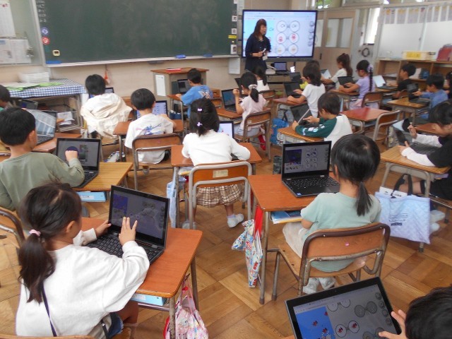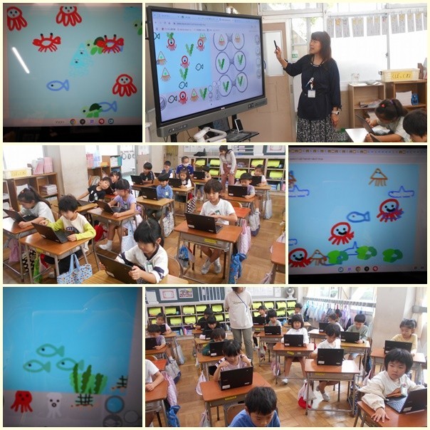 1年生がラインズさんによるプログラミングの授業をしています。自分でお絵かきした生き物が画面上の水族館で泳ぐという内容です。泳ぐ速さを変えることもできます。できたら、友達の作品も鑑賞します。操作の仕方をマスターして、だんだん楽しくなってきました。