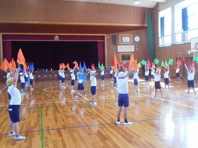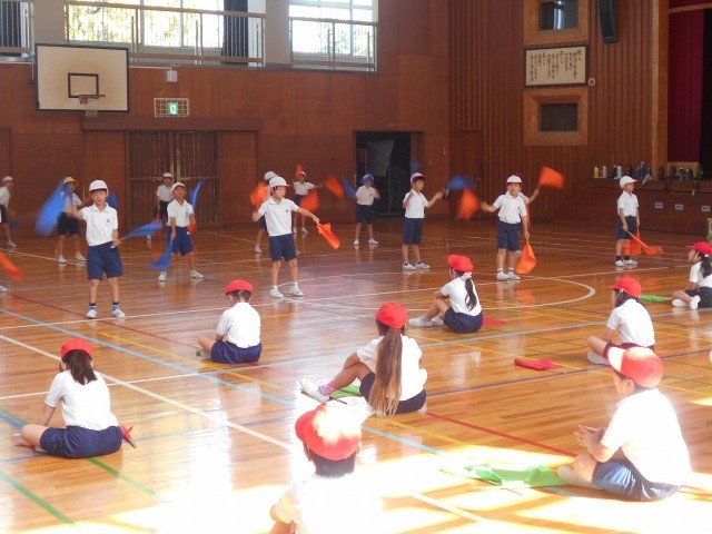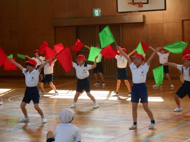 運動会に向けて、完成度を高めています。1組、2組とお互いに見合っていました。気をつけるポイントを意識して演技しています。最後のポーズは、みんなでタイミングを合わせてビシッと決まるとかっこいいですね。本番が楽しみです。