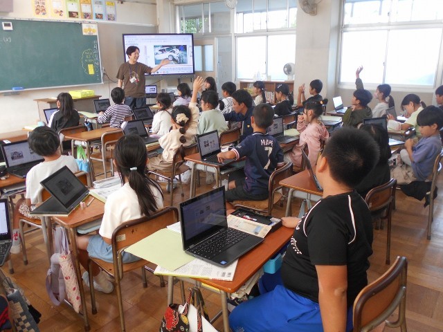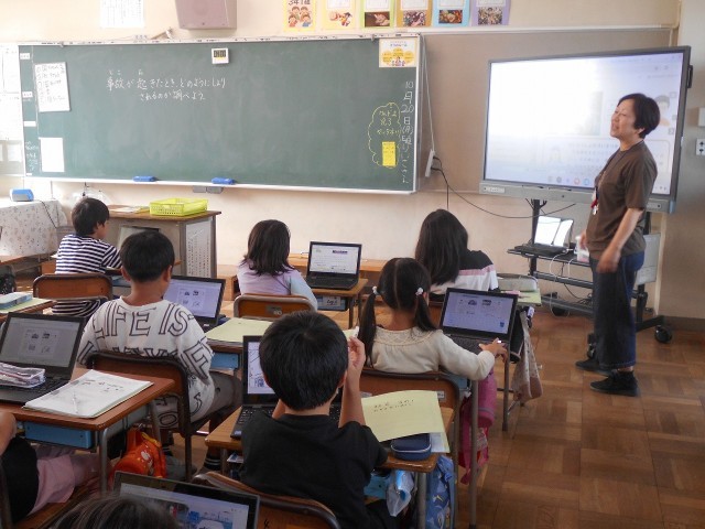交通事故が起きたときどうするのか、どんなところで事故が起きやすいのかについて、学習をしています。タブレットで資料を見ながら考えていました。木で視界が悪いところ、カーブしているところ、雨が降っていて前が見にくいときなど、次々に意見が出ていました。