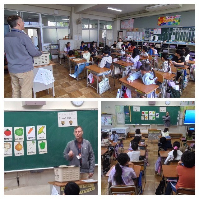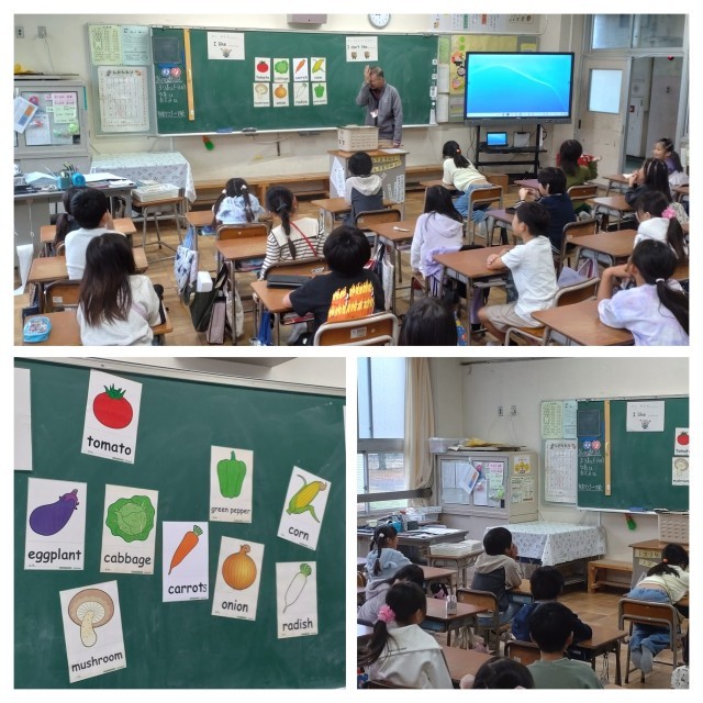 今日は、月に1回の外国語活動の授業がありました。マイク先生と、野菜や食べ物のカードを使った神経衰弱のゲームを楽しんだり、先ほどのカードで「I like ~」「I don't like ~」と周りに紹介しながら、楽しそうに活動する姿が見られました。