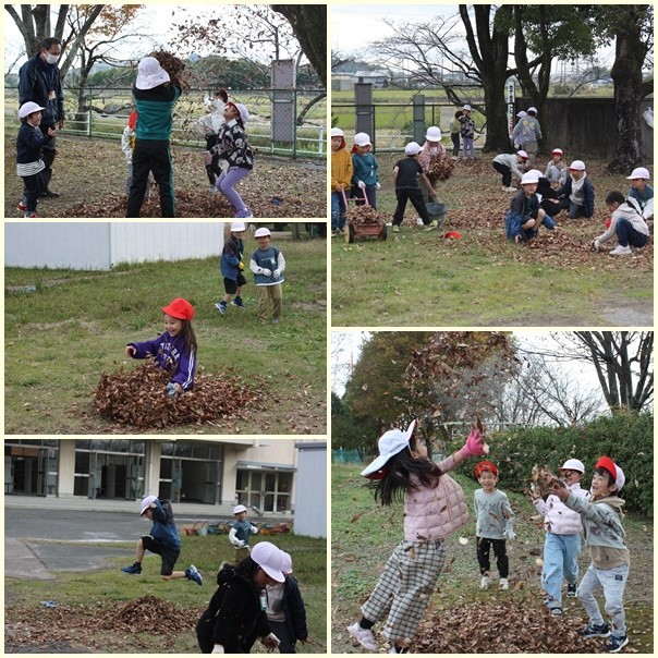 落ち葉あそびをしました。学校には落葉樹がたくさんあります。落ち葉を集めて山を作ったり、それを跳び越えてみたり、みんなで落ち葉吹雪を楽しんだりしました。何も言わなくても自然と遊びに興じる姿が見られました。そして、みんなが笑顔でした。