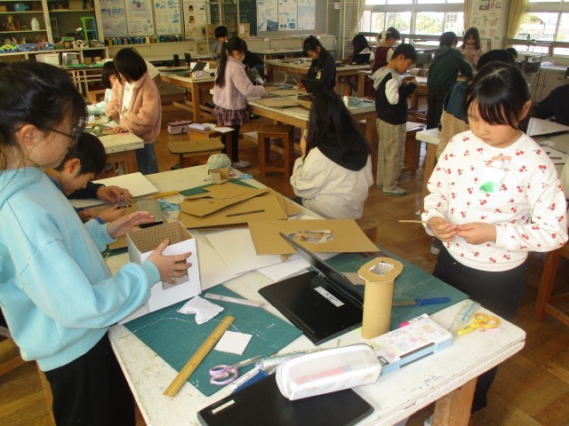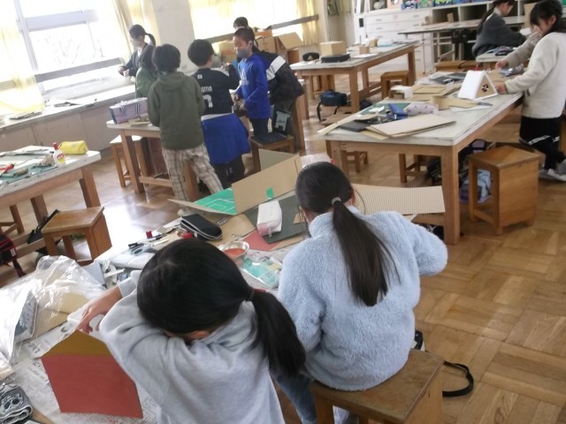 3年生 図工 公開日 2026/01/27 更新日 2026/01/27 3年生 3年生の図工では、段ボールを使った作品に取り組んでいます。段ボールを様々な形に切って、貼り付けながら作品を作っています。オリジナルのアイデアがたくさん詰まっていて、とても素敵な作品に仕上がってきています。 +3