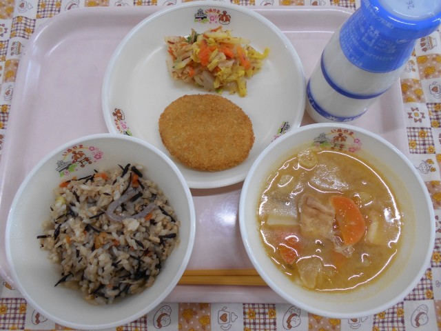 今日は今から100年くらい前の大正時代の給食です。この頃、日本の子どもたちは他の国の子に比べて体が小さくて病気になりやすいと心配されていました。そこで、給食でしっかり栄養をとって体を丈夫にしようとなったそうです。「五色ご飯」は、いろいろな種類の具材が入っていて、おかずが少なくてもしっかり栄養が取れる工夫がされたメニューです。今日も好き嫌いなく食べることができましたか。