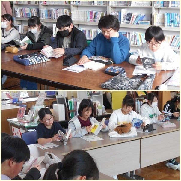 図書館司書さんによる読書回転寿司が行われました。今回は、多くの子が入学する東部中学校の図書館にある本を借りてきて実施されました。中学校にも図書館があり、入学すれば利用することができます。今日は、どんな本があるのか少し知る機会になりました。