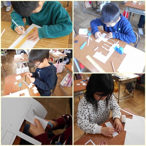 方眼紙を使って、箱作りに挑戦していました。どんな大きさの面がいくついるのかを考えて、実際に切ってテープで貼り合わせて箱にします。さあ、上手にできたしょうか。