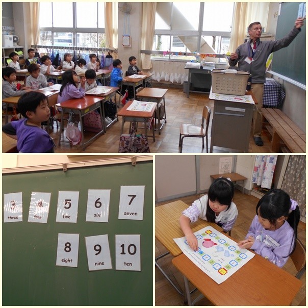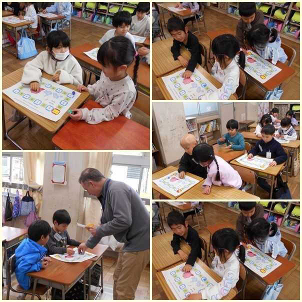 NETの先生と外国語活動を行いました。英語で数を数える学習です。発音の練習をした後は、ペアですごろくをしました。どの目が出ても、英語で数えながらコマを進めます。楽しく学ぶことができました。