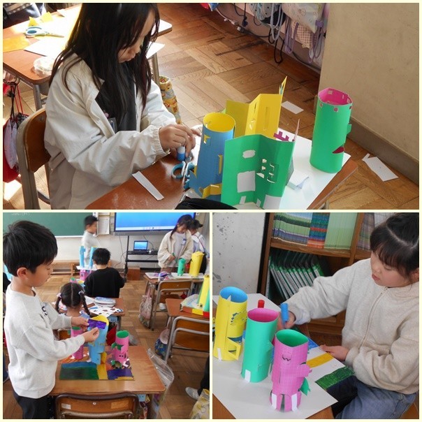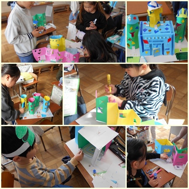 いろいろな形の窓を作り、立体感も出てきました。友達の作品を見て、「○○さんのはここがすごいよ!」とか「この窓、細かいけど上手に切っているよ」など、作品のよいところに見つけて教えてくれる子がたくさんいました。