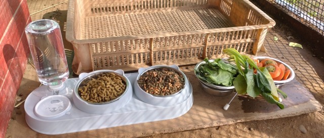 メメの小屋にある餌箱・水飲み容器が古くなっていたので、新年度を前に新しいものに交換し、あわせて小屋の中の藁もチモシーを主体としたものに交換しました。