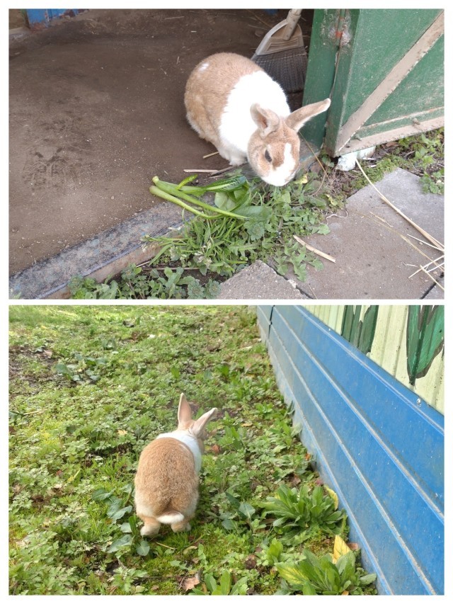 交換している間、お腹がすいていたのか、メメは小屋を脱走して、小屋周りの草を食べ歩いていました。