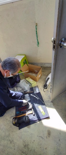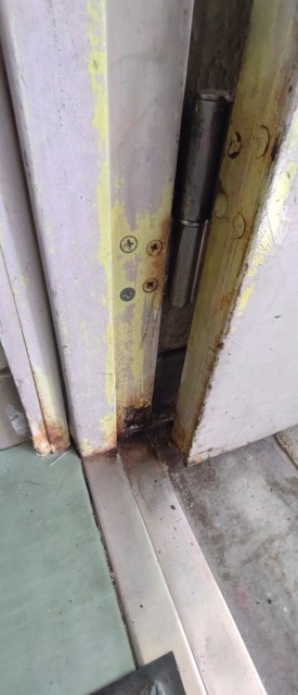 渡り廊下のドアも、長年の風雨にさらされ、錆が浮き上がったりして扉の開閉がスムーズにいかない箇所が何か所かありました。春休みを利用して、修繕を行っていただきました。